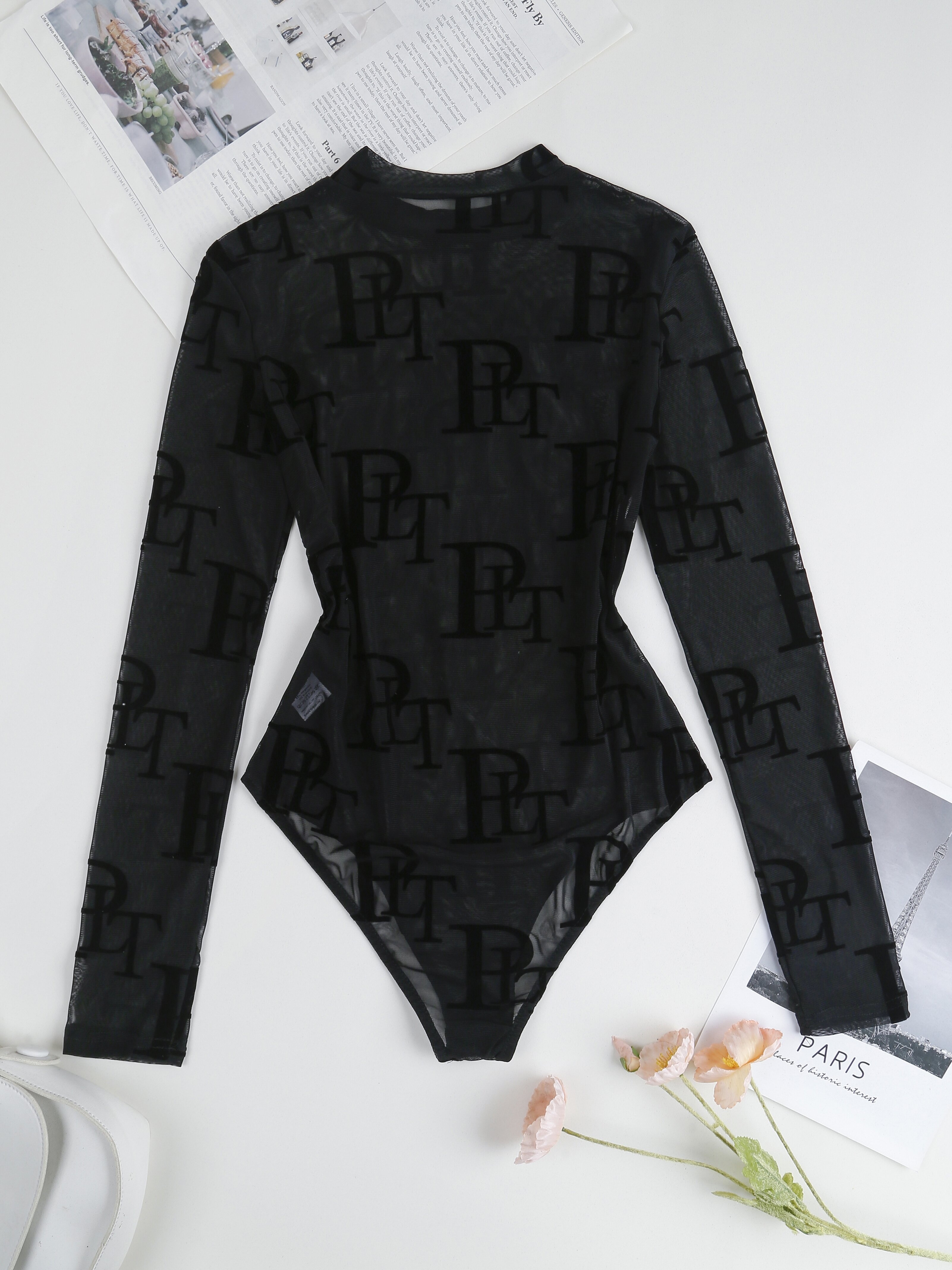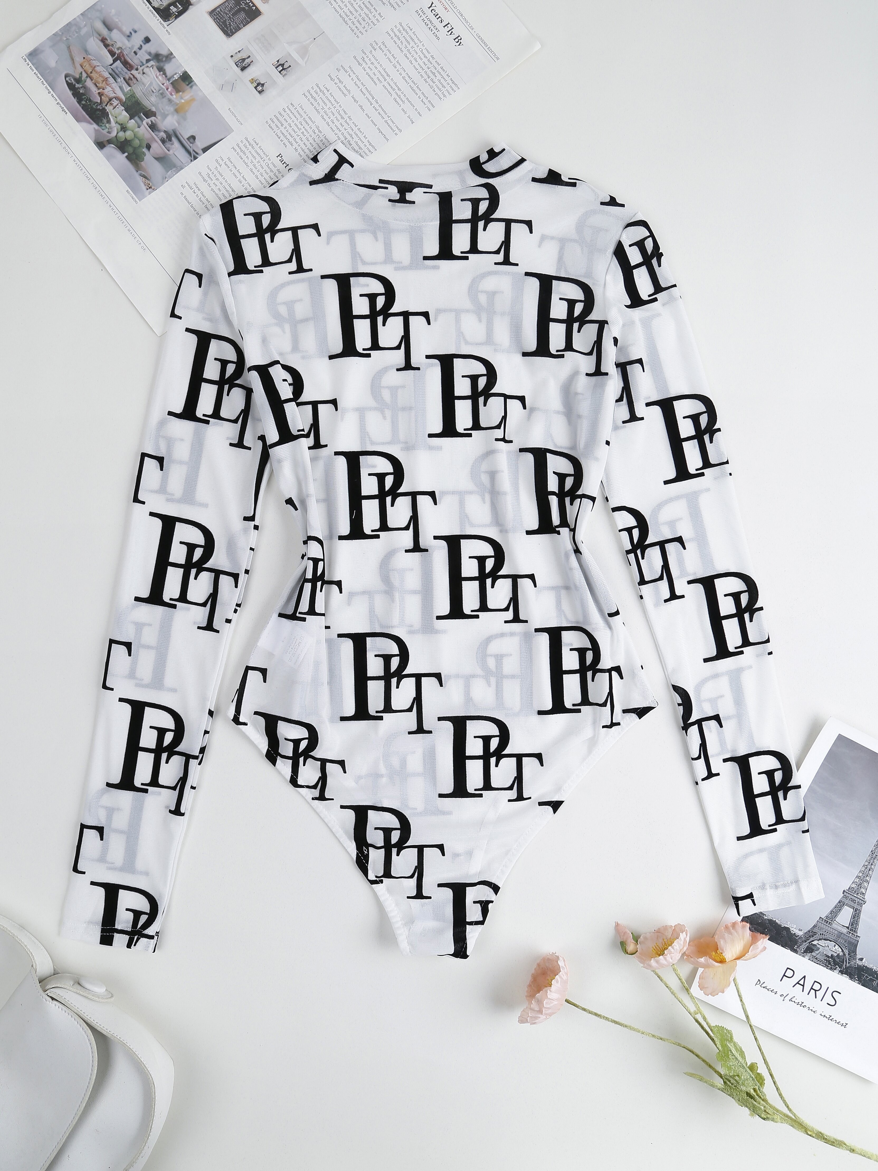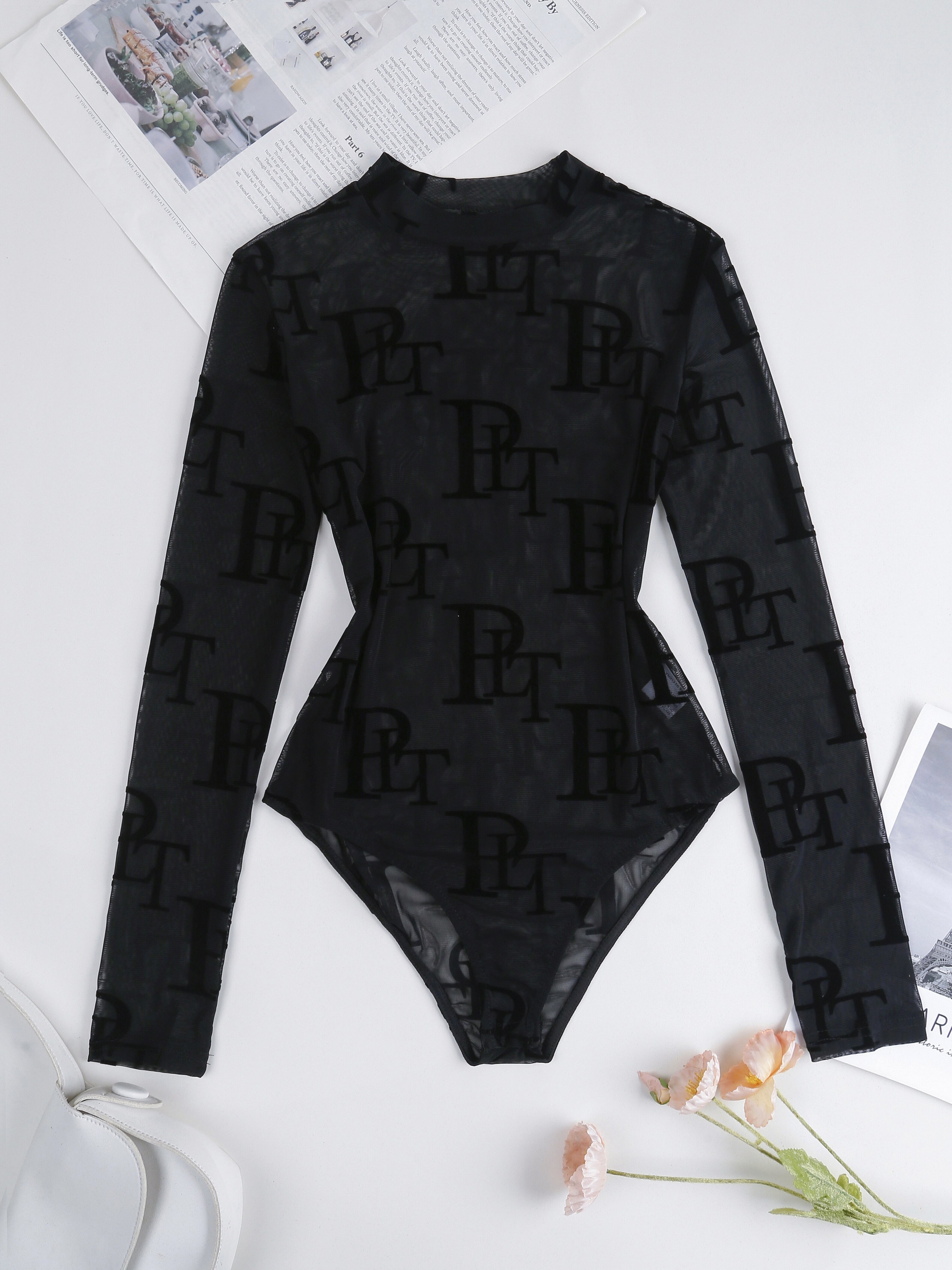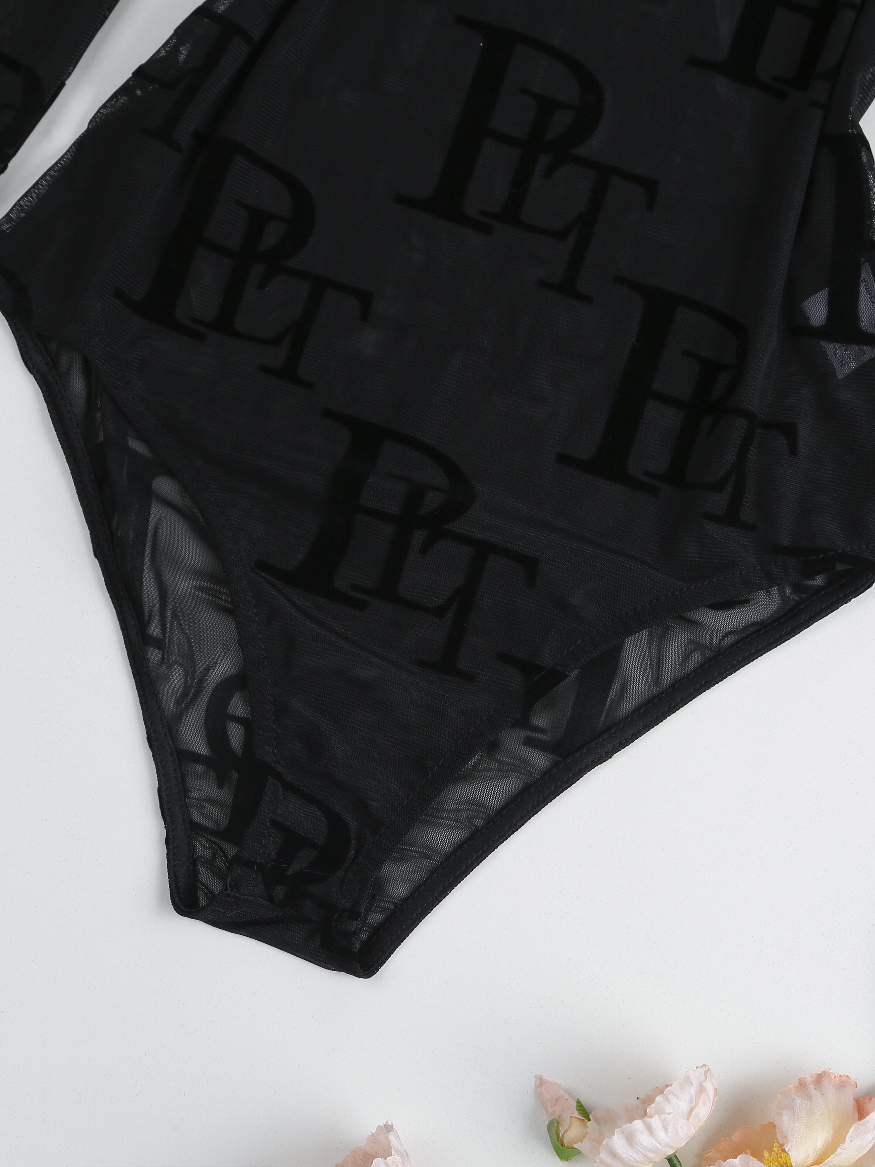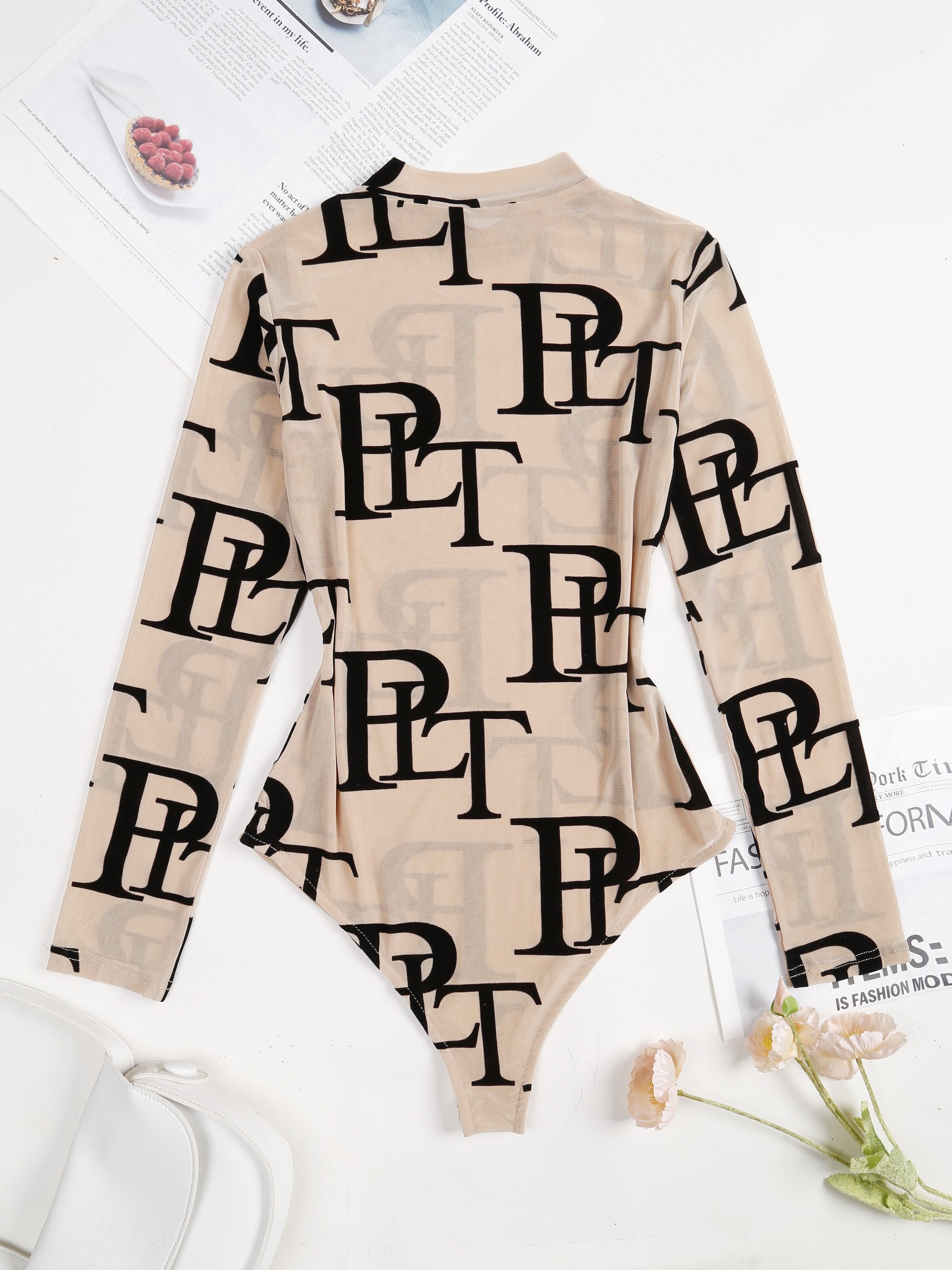 Chic Letter Print Sheer Bodysuit - Flattering Mock Neck & Long Sleeves - Seducti