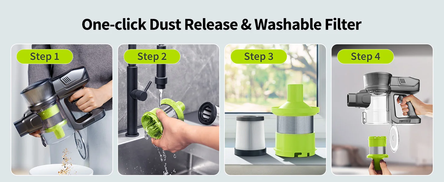 The dust cup of hoover cordless has a large capacity of 1.2L, no need to carry around bags for garbage anymore, making cleaning more convenient.