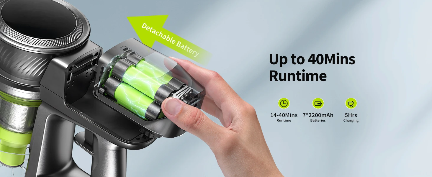 1 Self-standing Storage 2 Lightweight to Use 3 3 Speed Suction Power 4 Removable Battery 5 Up to 40Mins Runtime
