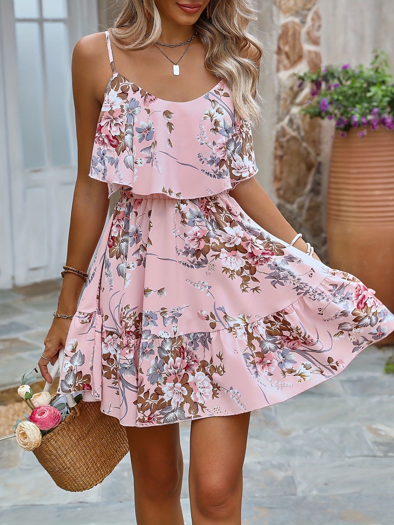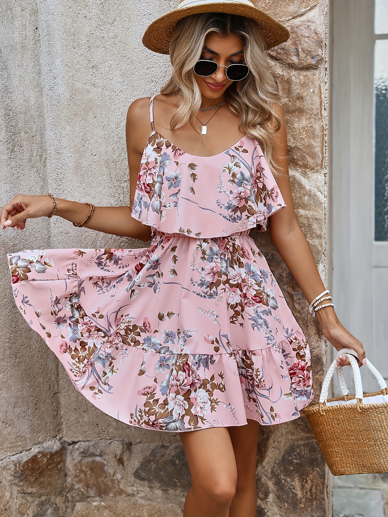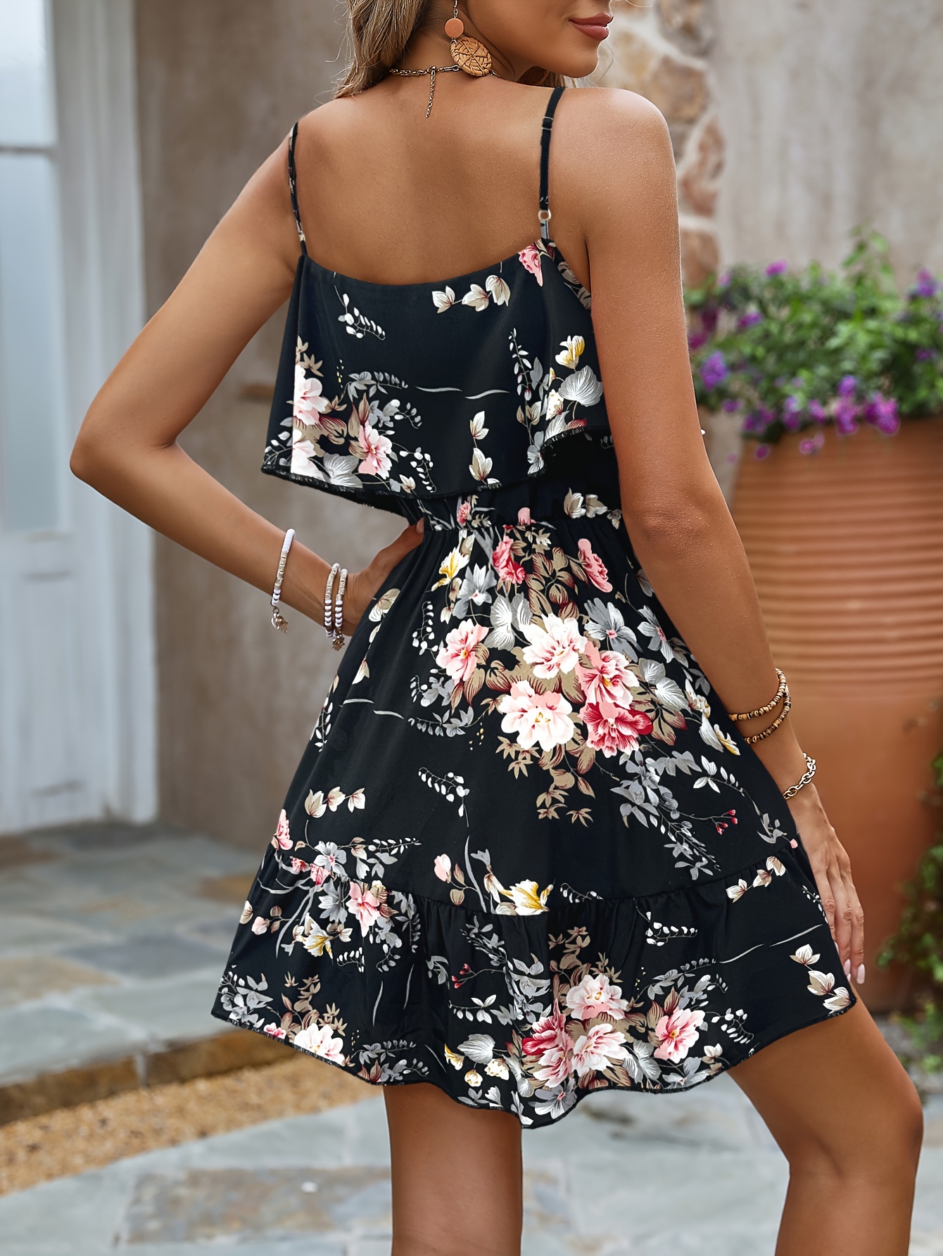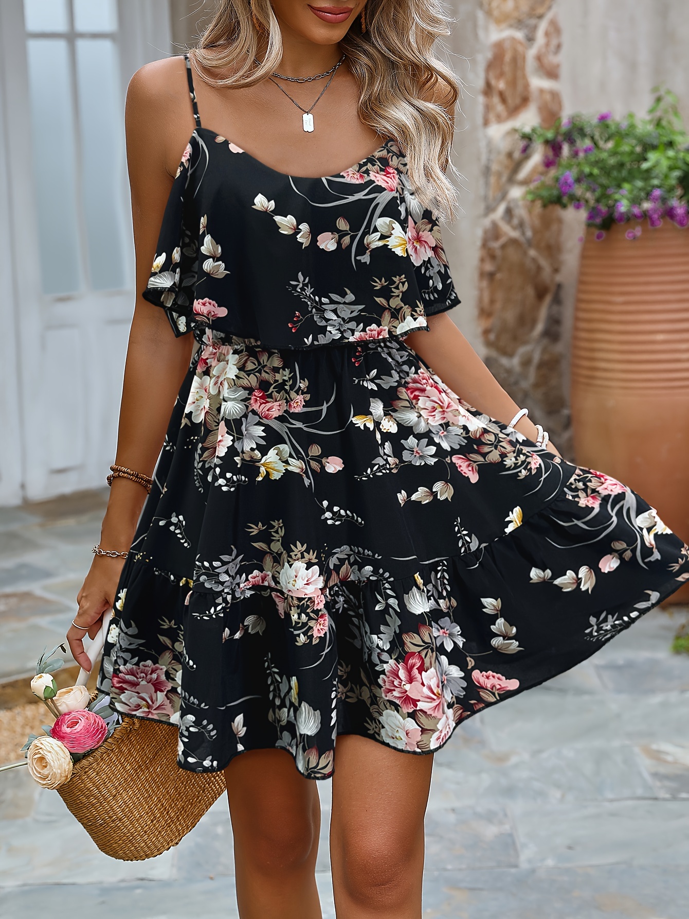 [Feminine Charm] Chic Floral Off-Shoulder Ruffle Mini Dress for Women - Casual A