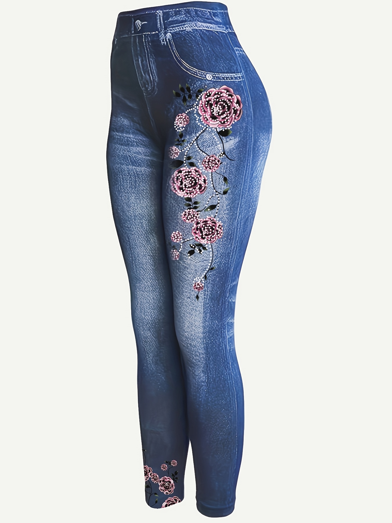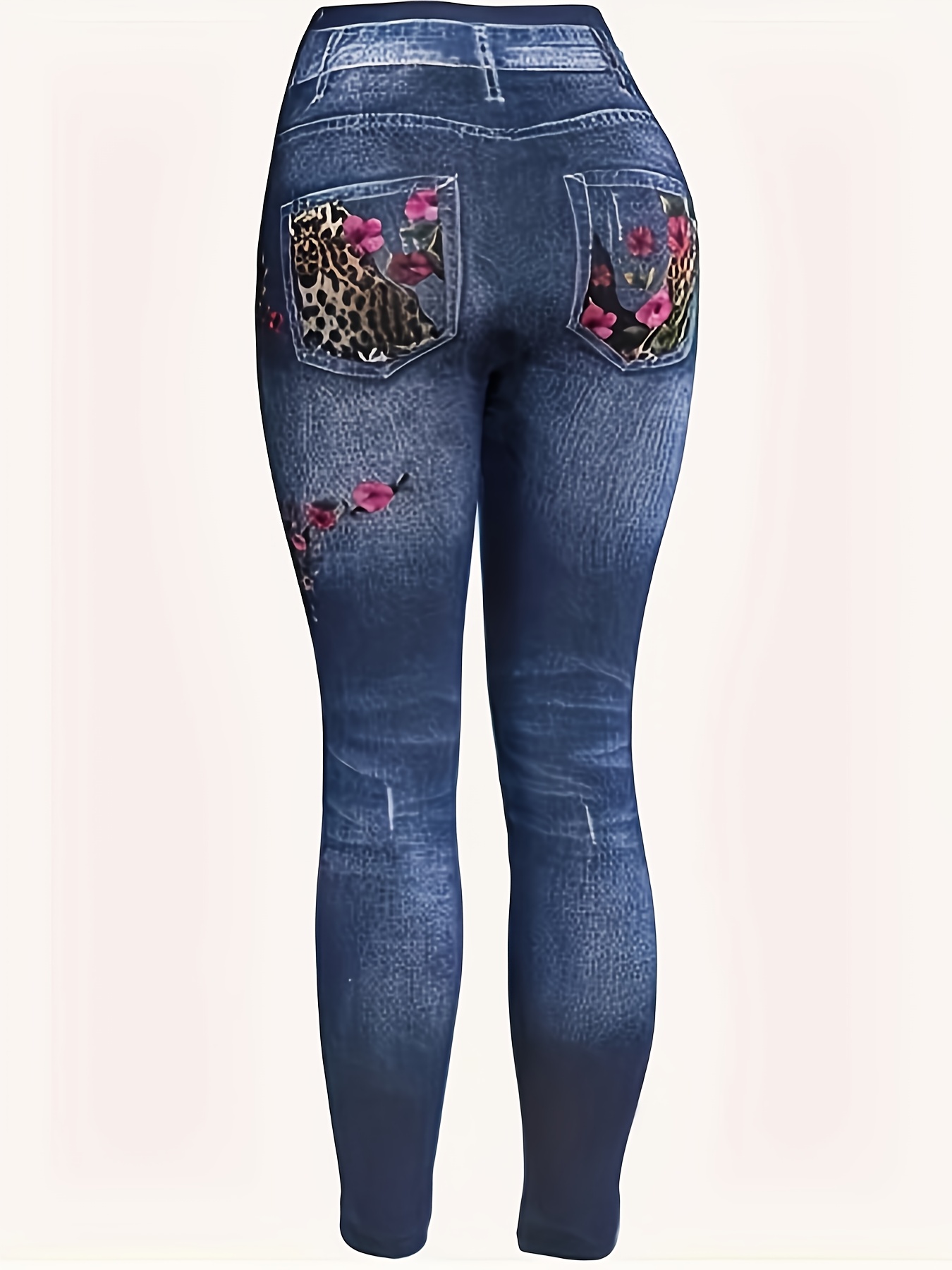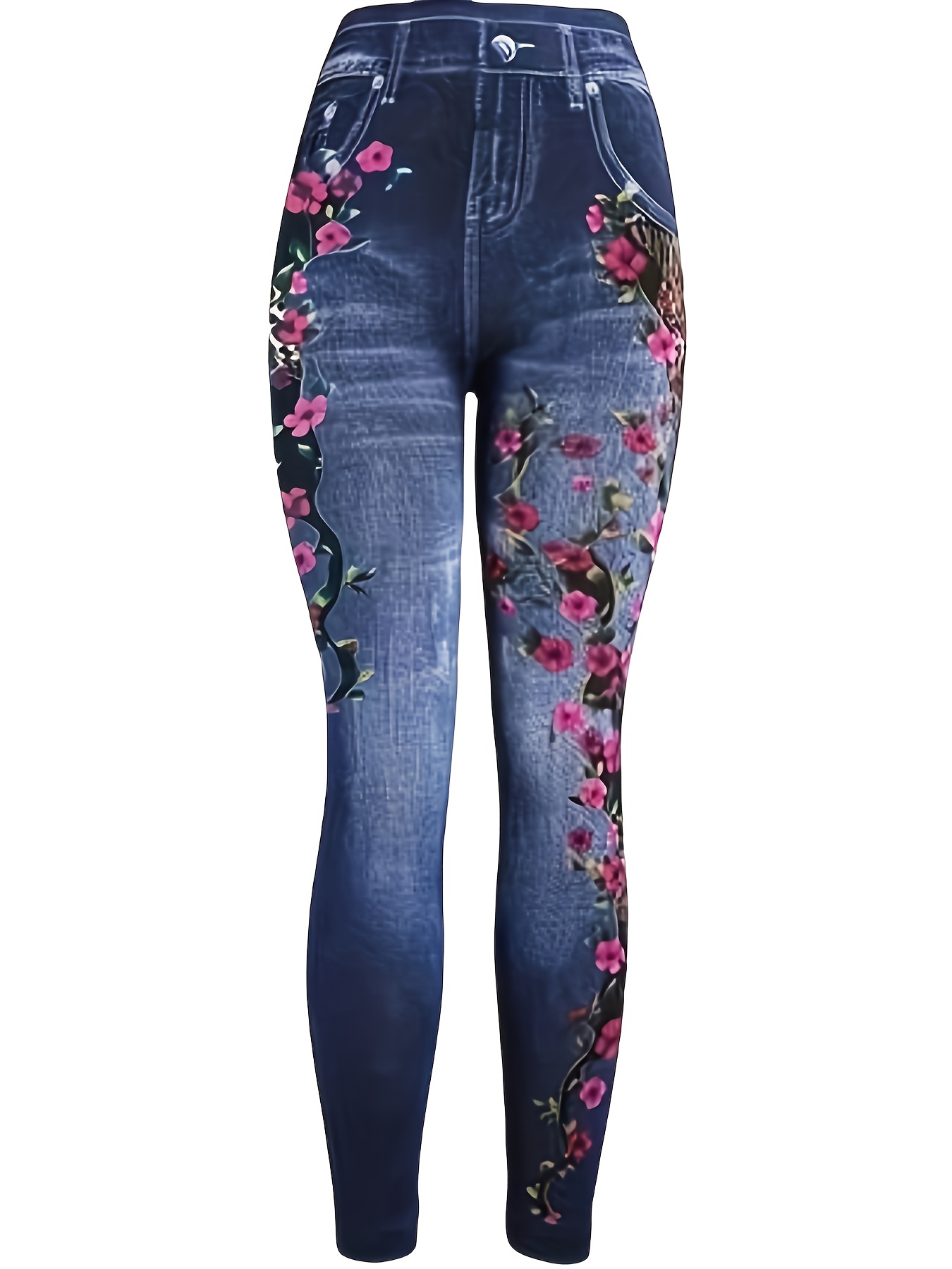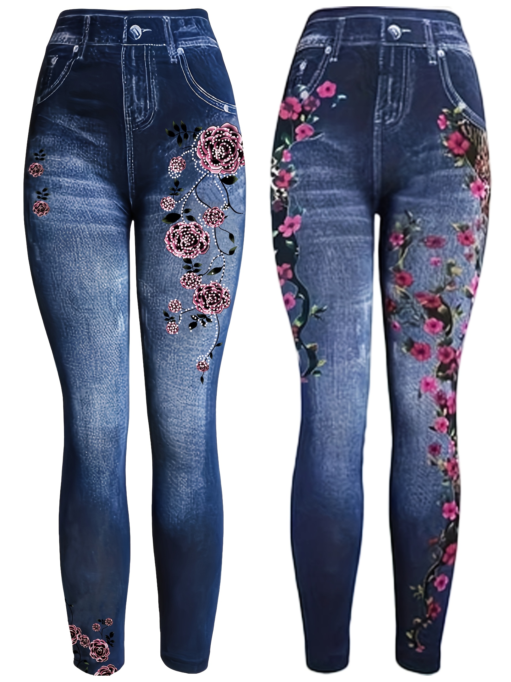 High-Waisted 2-Pack Floral Print Skinny Fit Pants - Women's Casual Polyester Kni