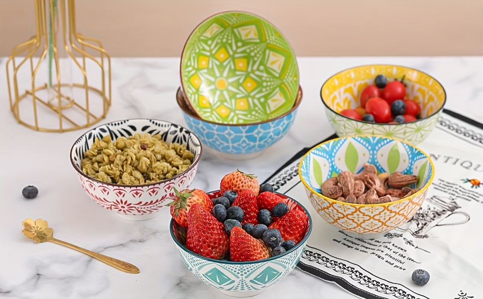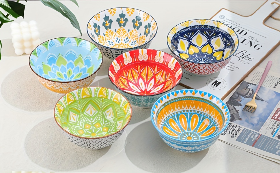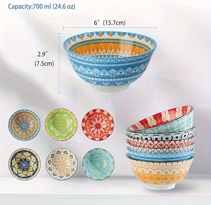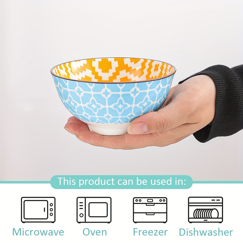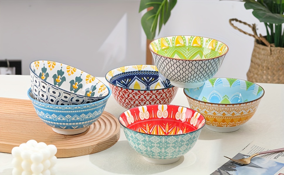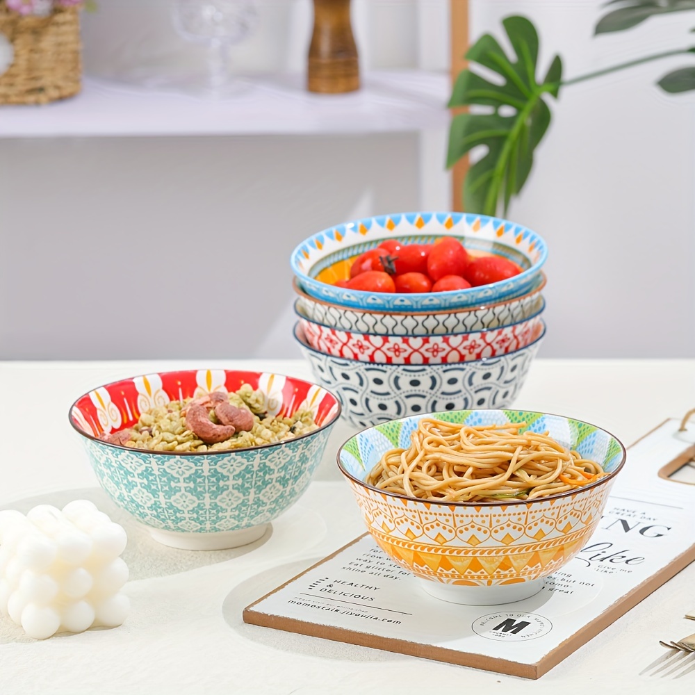 Set of 6 Porcelain Ceramic Deep Bowls - Colorful Microwave and Dishwasher Safe f