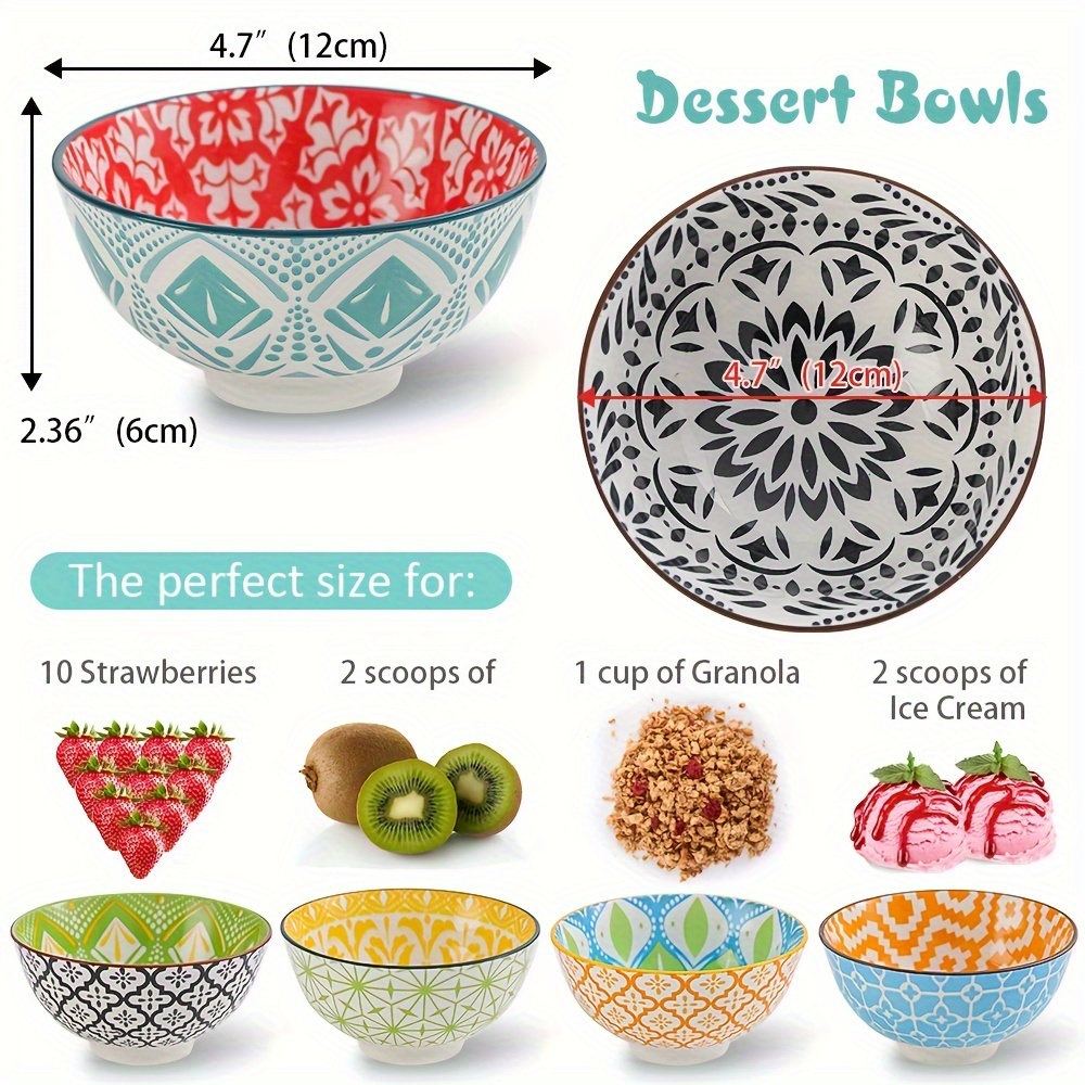 A lightweight 10 oz(4.5 inch in diameter) colored serving bowls are perfect for cereal, oatmeal, soup, snack, rice, side dishes, dessert or ice cream.Diameter: 6.25 inch capacity: 23-Ounce