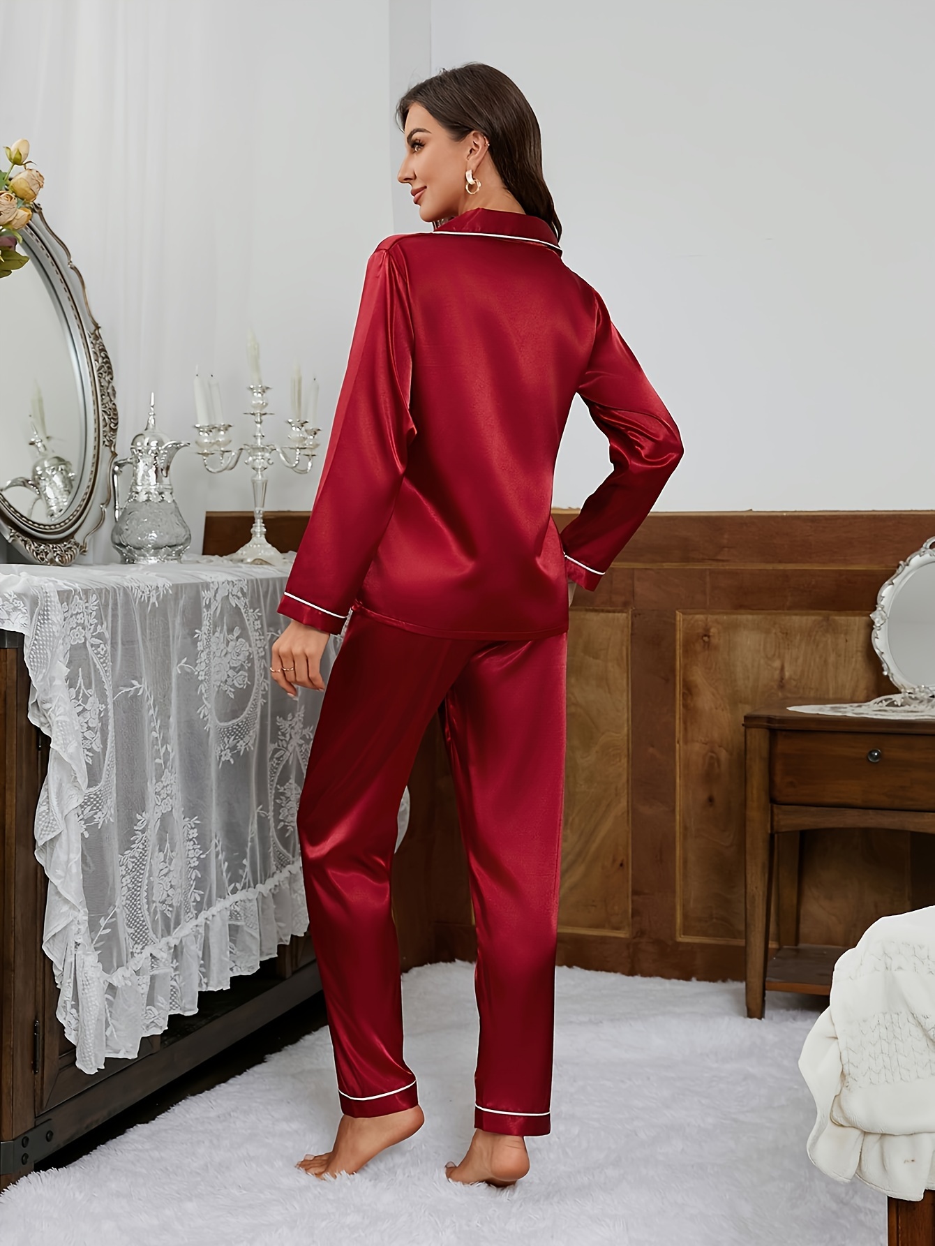 Women'S Sexy Satin Pajama Set, Long Sleeve & Pants, Solid Color, All-Season Poly